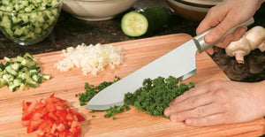 This is a whopper of a knife and is possibly the most-desired knife for any kitchen. What makes it special is the large blade, shaped in a way that allows the user to rock it back and forth for dicing and mincing fresh herbs and vegetables.