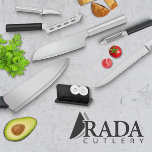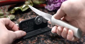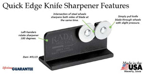 Our Quick Edge Knife Sharpener sharpens all your smooth-edged Rada knives with just a couple of gentle passes between the specially edged and hardened steel wheels.