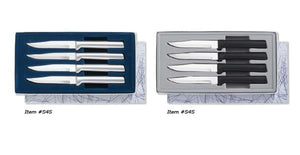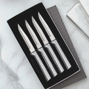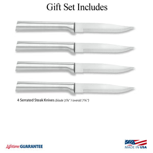 This set includes four Serrated Steak Knives, perfect for a small family, as an add-on to a previously purchased set, or as a way to kindly eliminate the inferior steak knives in someone’s kitchen. All serrated blades, of course. In your choice of silver or black handles. With a Rada gift set, wrapping isn’t necessary—simply add a bow if you wish. Our gift boxes include form-fitting thermal inserts, making them safe for gift giving and knife storage. With a gift of Four Serrated Steak Knives, you’ll bring peace to the dinner table.