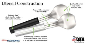 This utensil has two handle options. The silver handle is made from permanently cast silver brushed aluminum and has a satin finish. The black handle is constructed from black stainless steel resin. Both fit beautifully into any kitchen décor.