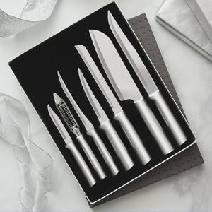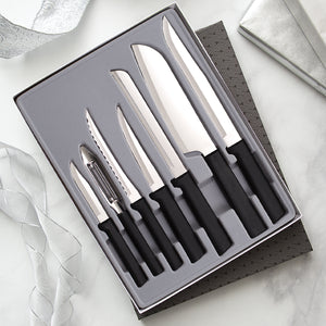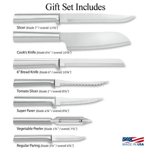 This set includes our Regular Paring, Vegetable Peeler, Tomato Slicer, Super Parer, 6" Bread Knife, Cook’s Knife, and Slicer. This is a great set for anyone who loves to cook—whether they’re just starting out or are seasoned cooks. In your choice of silver or black handles. With a Rada gift set, wrapping isn’t necessary—simply add a bow if you wish. Our gift boxes include form-fitting thermal inserts, making them safe for gift giving and knife storage. Give the gift of Rada’s Starter Gift Set and make any cook—beginner to pro—very happy.