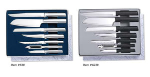 Included in this set are the Regular Paring, Vegetable Peeler, Tomato Slicer, Super Parer, 6" Bread Knife, Cook’s Knife, and Slicer. In your choice of silver or black handles.